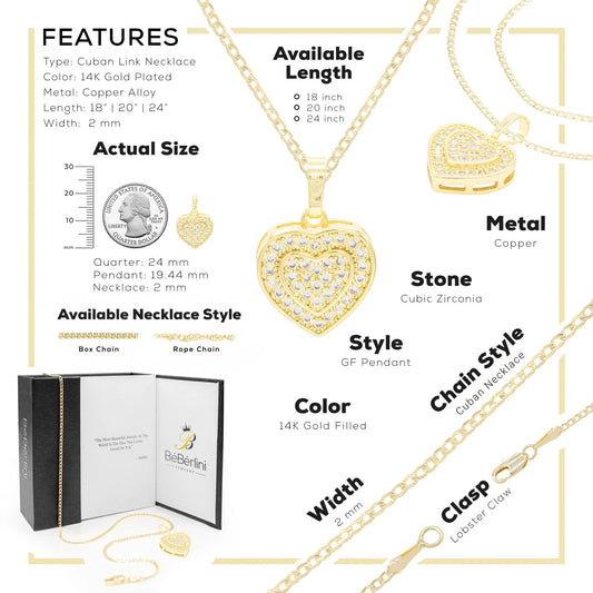 Women Heart CZ Pendant Necklace Set 14K Gold Filled Cuban Chain Jewelry 20"
